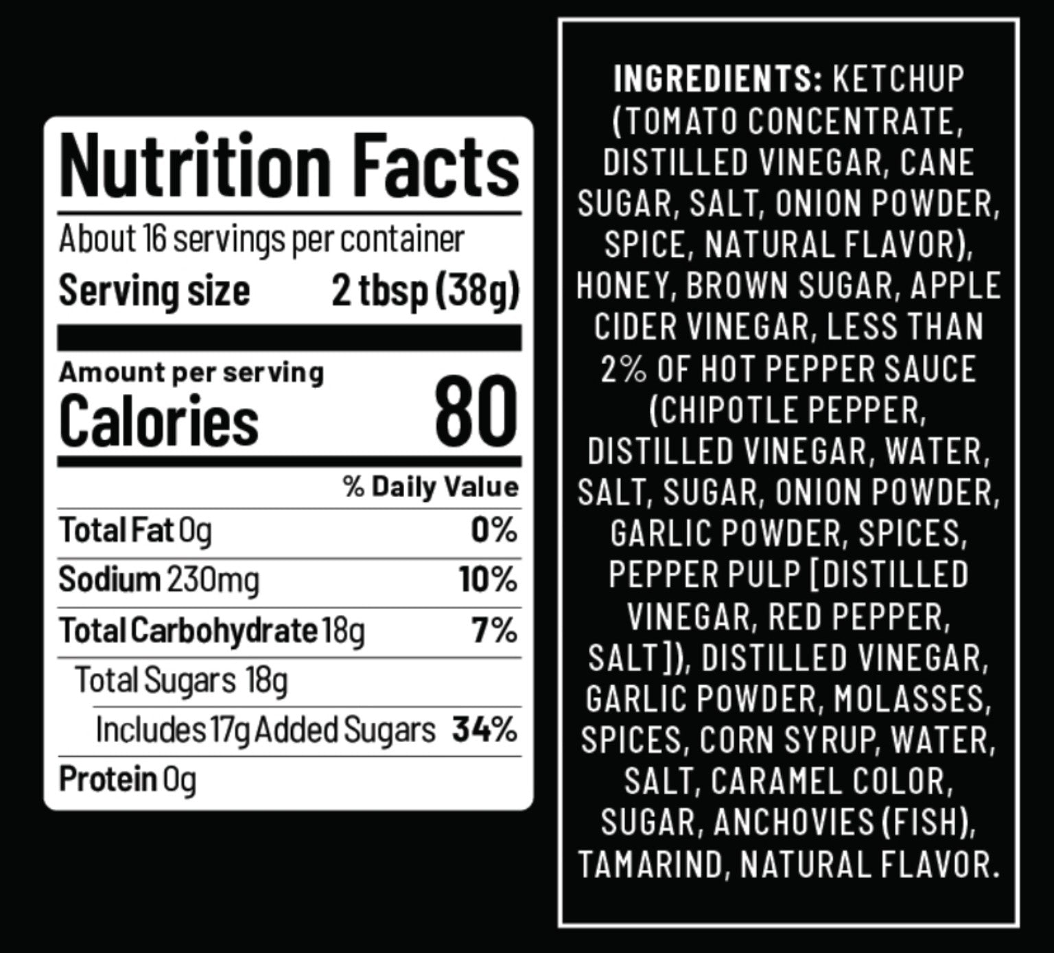 Ketchup (Tomato Concentrate, Distilled Vinegar, Cane Sugar, Salt, Onion Powder, Spice, Natural Flavor), Honey, Brown Sugar, Apple Cider Vinegar, Less than 2% of Hot Pepper Sauce (Chipotle Pepper, Distilled Vinegar, Water, Salt, Sugar, Onion Powder, Garlic Powder, Spices, Pepper Pulp [Distilled Vinegar, Red Pepper, Salt]), Distilled Vinegar, Garlic Powder, Molasses, Spices, Corn Syrup, Water, Salt, Caramel Color, Sugar, Anchovies (Fish), Tamarind, Natural Flavor.