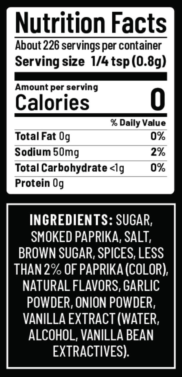 Sugar, Smoked Paprika, Salt, Brown Sugar, Spices, Less than 2% of Paprika (Color), Natural Flavors, Garlic Powder, Onion Powder, Vanilla Extract (Water, Alcohol, Vanilla Bean Extractives).